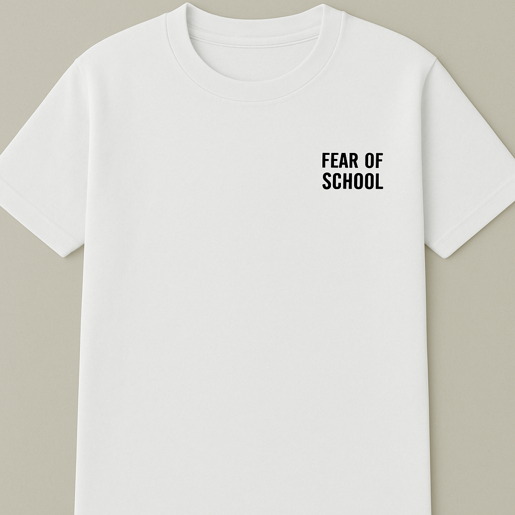 This white cotton t-shirt features a minimalist design with the phrase "FEAR OF SCHOOL" printed in crisp black lettering over the left chest. The sleek font and precise placement offer a subtle but powerful expression of rebellion, irony, or nostalgia—perfect for those who like to speak volumes without saying much.